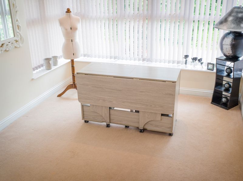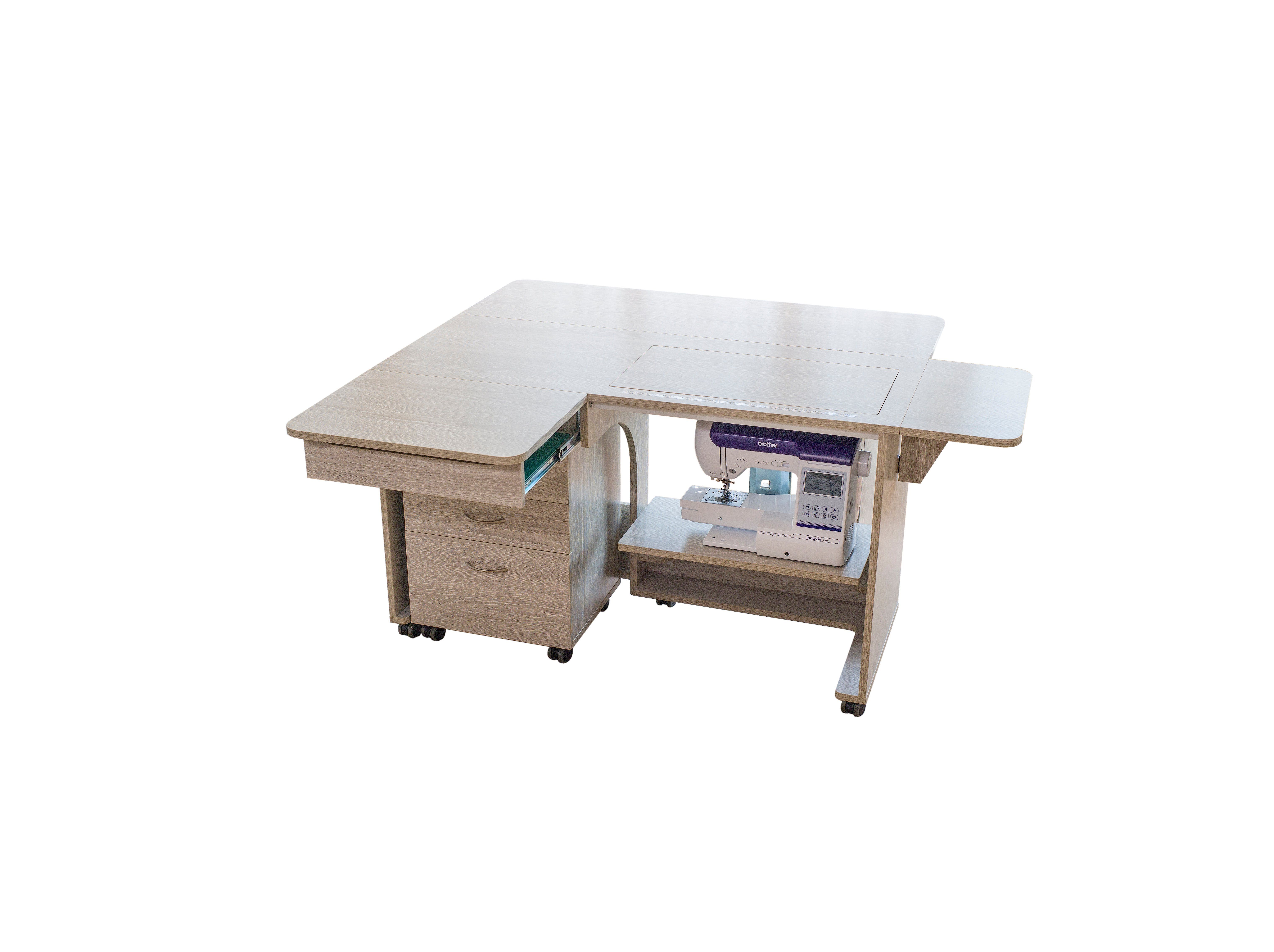 The Horn Quilters Delight Mk2 has a large working area positioned all around the cabinet which is able to support even the largest projects not only that there is also a handy mobile set of drawers which when stored sits tidily inside the main table, so reducing its floor space, but when pulled out it can be moved on its castors in relation to where's best for you. On the back of the Quilter's Delight Mk2 is a large foldable work area. The large foldable work area is ideal for supporting larger items like quilts and curtains while sewing and this area can also be used as a cutting area when the machine is not in use.